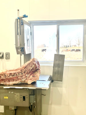 Once harvested, animals come straight back to our on-farm butcher shop — opened in December 2022 — where all dry aging, cutting, and packaging takes place.